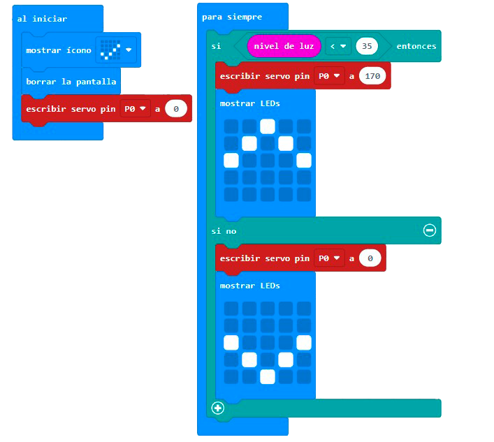 Utilizamos un servomotor para controlar una persiana del hogar con dependiendo del nivel de luz. Cuando la luz ambiente sea baja, el servomotor subirá para dejar pasar la luz del exterior y en caso contrario la persiana bajará. Podemos utilizar la matriz de leds para proporcionar algún tipo de información.