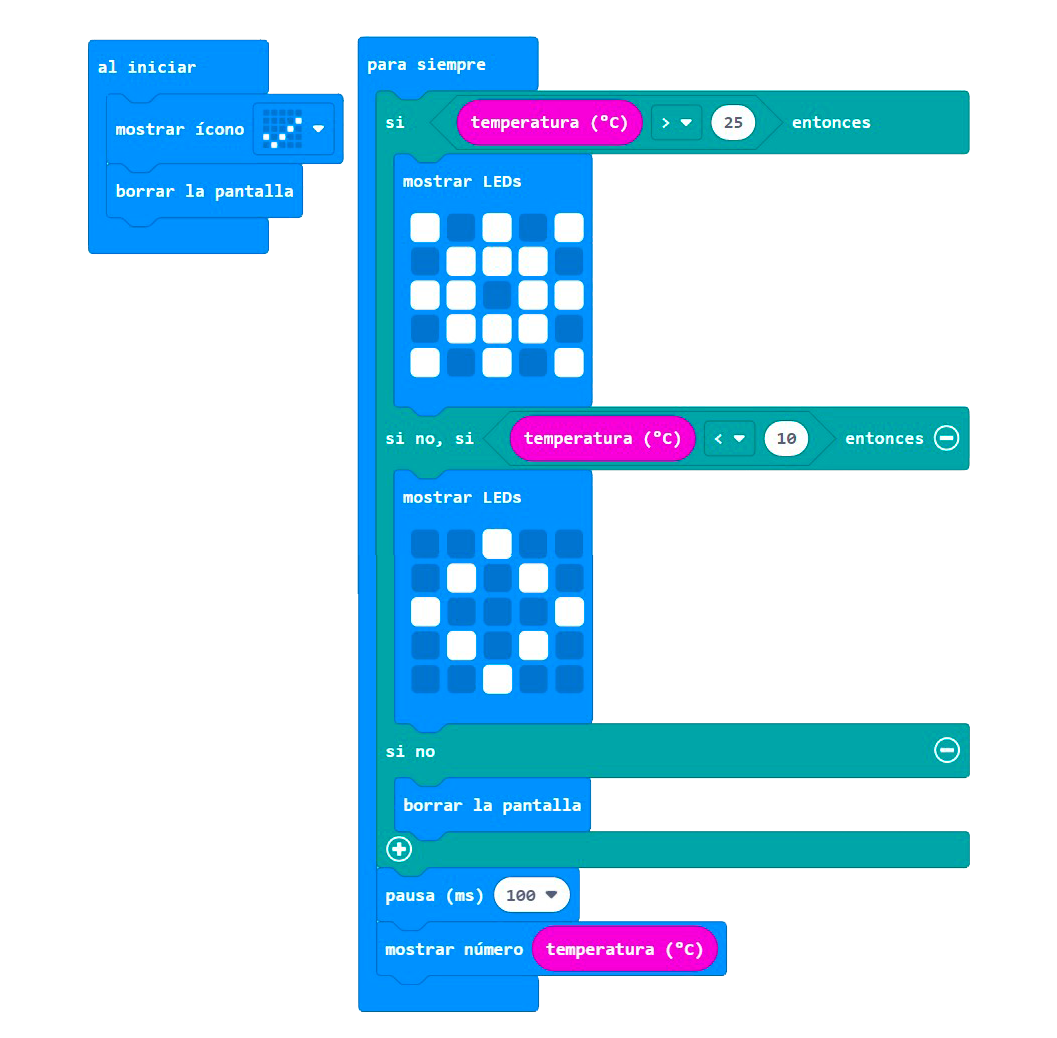 Un termostato controla la temperatura del hogar y acciona un dispositivo en función del nivel de temperatura. Programa un termostato que muestre la temperatura en ºC cada cierto tiempo. Como actuador, utilizaremos la matriz de leds que mostrará un sol al superar los 25º y un copo de nieve con la temperatura por debajo de los 10º.